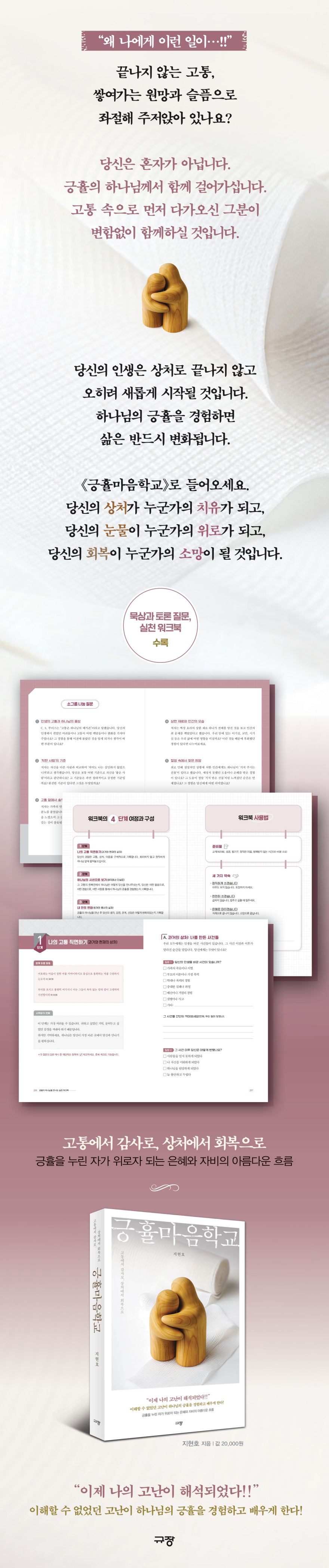 제가 겪었던 상처들은 인생의 끝이 아니라 새로운 시작이었고 그 모든 아픔은 누군가의 회복을 위해 하나님이 미리 준비해주신 소중한 과정이었습니다. 당신도 그럴 것입니다. 당신의 상처가 누군가의 치유가 되고 당신의 눈물이 누군가에게 위로가 되며 당신의 회복이 누군가의 소망이 될 것입니다. ‘긍휼마음학교’라는 아름다운 여정을 함께 걸어봅시다. 이 여행이 끝날 때쯤 당신은 다른 사람이 되어 있을 것입니다.