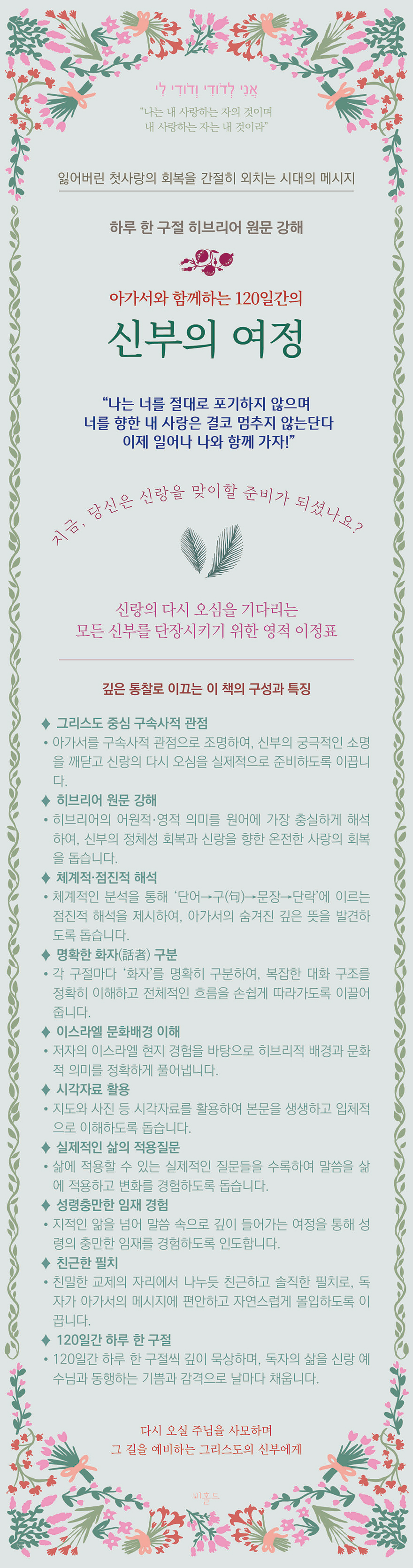 아가서는 신랑 되신 예수 그리스도와 그분을 사모하는 신부의 영원한 사랑을 노래합니다. 그럼에도 불구하고 많은 이들이 난해한 문맥과 복잡한 화자로 인해 그 속에 담긴 깊은 사랑의 메시지를 놓치곤 합니다. 이 책은 아가서의 난해함이라는 장벽을 허물고 진리를 온전히 드러내기 위해 히브리어 원어에 충실한 해석과 깊은 영적 통찰을 담아냈습니다. 이를 통해 단순한 지적인 앎에 머물지 않고, 신랑의 사랑 안으로 깊이 들어가는 실제적인 신부의 여정을 제시하고자 합니다. 이제 우리는 120일간의 이 여정 속에서 그리스도 중심의 구속사적 관점으로 아가서를 조명하며, 신부의 궁극적인 소명이 무엇인지 깨닫게 될 것입니다. 구절마다 새겨진 신랑 예수님의 마음을 발견하십시오. 신부의 정체성을 회복하여 온전한 사랑으로 신랑의 다시 오심을 예비하는 거룩한 신부로 단장되시기를 소망합니다.