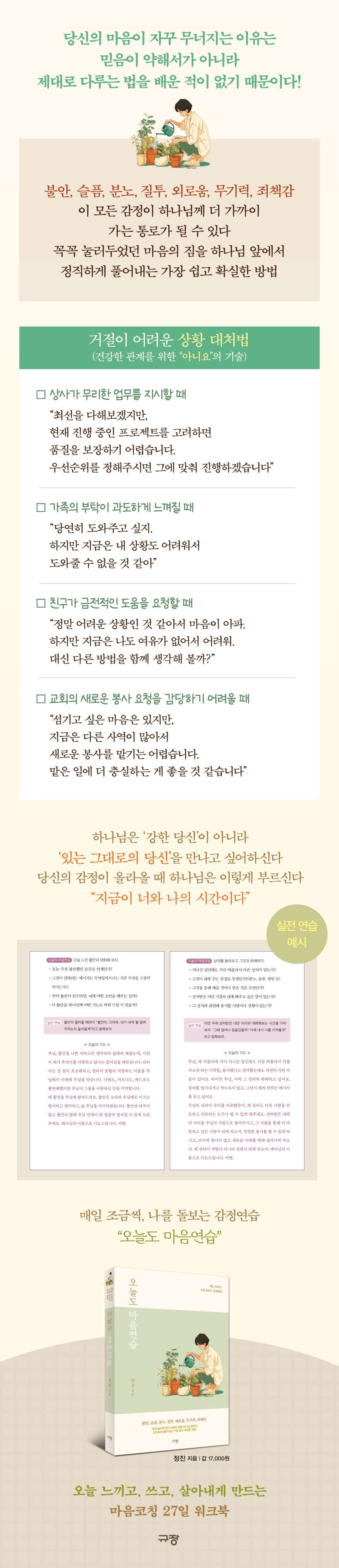 《오늘도 마음연습》은 좋은 말로 위로하는 책이 아니라, 수시로 올라오는 감정을 하나님 앞에서 정직하게 풀어내는 현실적이고 실제적인 방법을 안내한다. 사람들의 말 한마디에 쉽게 상처받고, 매사에 불안하며, 가정·직장·교회에서의 관계가 버거워 기쁨과 평안이 없고, 자존감까지 흔들리는 나를 돌아보고 회복을 돕는 감정 훈련서이다.